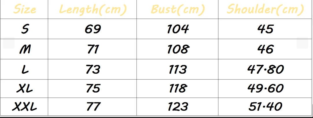 size_info: {"sizeInfoList":[{"length":{"cm":"104","inch":"40.94"},"size":"S","vid":-1},{"length":{"cm":"108","inch":"42.52"},"size":"M","vid":-2},{"length":{"cm":"113","inch":"44.49"},"size":"L","vid":-3},{"length":{"cm":"118","inch":"46.46"},"size":"XL","vid":-4},{"length":{"cm":"123","inch":"48.43"},"size":"XXL","vid":-5}]}